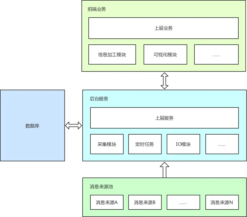 如图3.1所示,通过后台服务从消息来源池里采集到数据之后,可以把数据建立一个库存储起来,提供一些数据服务接口供前端业务使用。你可以对数据进行处理、加工,可视化出来,比如直接以前端Web页面的形式呈现,也可以做一个原生的APP。甚至加上一些反馈渠道,对信息进行评价,从而从评价数据反推消息来源渠道的质量。