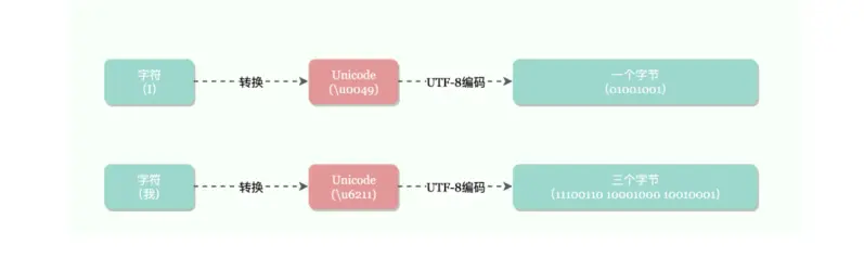 Unicode 作为现在通用的字符集,通常采用两个字节表示一个字符,带来的副作用就是,原本采用 ASCII 字符集只需要一个字节的,却变成了 2 个字节,造成了空间浪费,而 UTF-8 编码规则,将 Unicode 编码成 1~4 个字节,ASCII 字符集继续保持了 1 个字节空间,而中文编码成了三个字节,如下图。