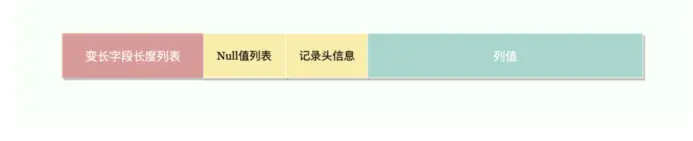 上面只是对列为 char(5) 的数据进行说明,在真实数据库表中,会存在多列 varchar 或 char 类型,由上可知变长编码规则的 char 也是按 varchar 处理的,所以这些列的实际占用字节数都会逆序存放在行格式首部,被称为变长字段长度列表,而每列的数据,则是顺序存放在列值中,如下图,至于变长字段长度列表和 Null 值列表为什么是逆序的,大家有兴趣可以去想想。
