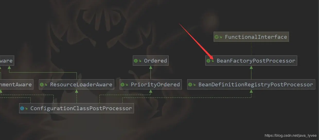 说白了就是——beanFactory怎么new出来的(实例化)BeanFactoryPostProcessor是干预不了的,但是beanFactory new出来之后各种属性的填充或者修改(初始化)是可以通过BeanFactoryPostProcessor来干预;可以看到BeanFactoryPostProcessor里唯一的方法postProcessBeanFactory中唯一的参数就是一个标准的beanFactory对象——ConfigurableListableBeanFactory;既然spring在调用postProcessBeanFactory方法的时候把已经实例化好的beanFactory对象传过来了,那么自然而然我们可以对这个beanFactory肆意妄为了;