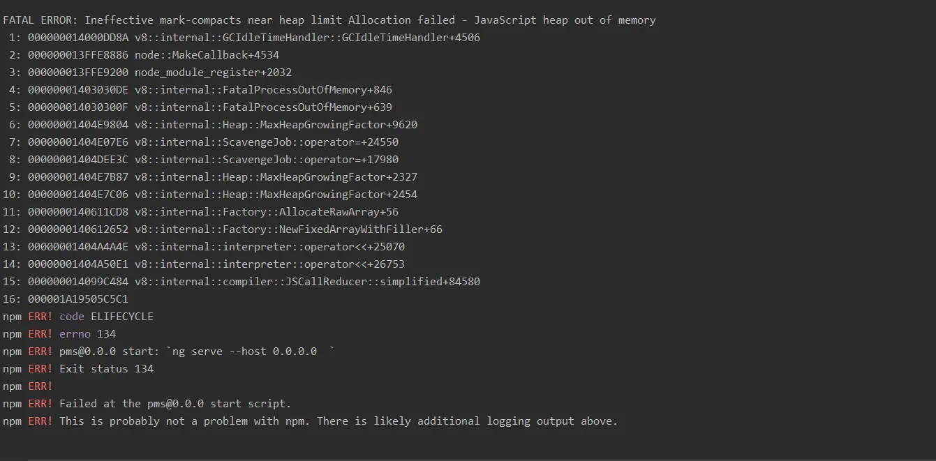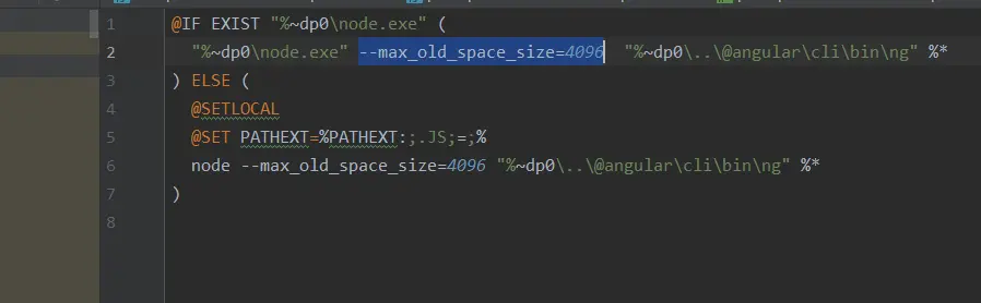在当前工程目录下的 node_modules\ .bin\ng.cmd 添加以下代码 --max_old_space_size=4096 添加位置如图