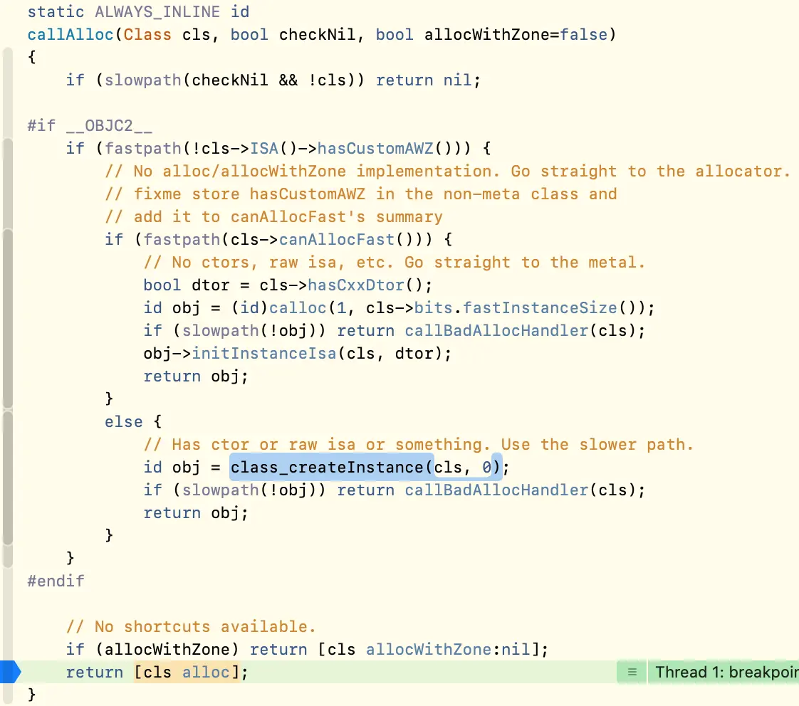 如果在编译期调用那就不能直接进行探索了,这时就需要借助 LLVM ,因为 objc_alloc 的源码苹果官方并没有公布出来,所以这并不是 objc_alloc 源码,然后只能在 LLVM 里找到一些与 objc_alloc 相关的东西进行分析