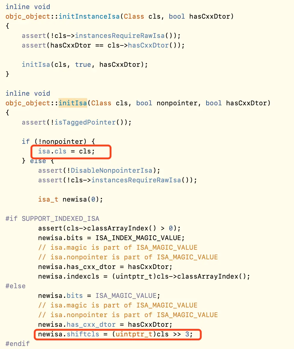 根据上图看 !nonpointer 是,其中只对 cls 赋了值,然后就没有其他信息了,再看 else 的内存可以看到的是,除了 shiftcls 还有其他信息,比如bits,has_cxx_dtor,这就是 !nonpointer 判断的意义点了 。