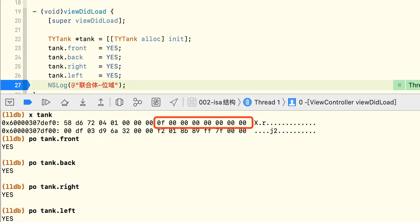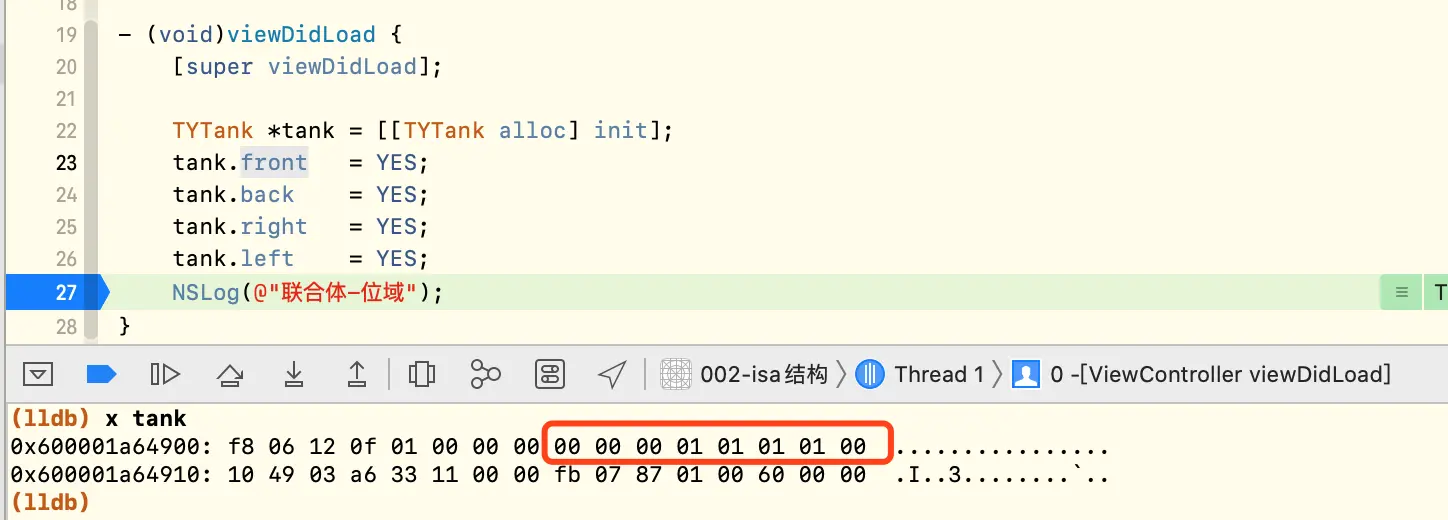 联合体大小为其内部所有变量的最大值,由于 isa 这个联合体内部有结构体,结构的大小为 8 字节,uintptr_t 为 long 型,long 型也是 8 字节,由此可是 isa 这个联合体的大小为8字节。也就意味着总共有 64 位。关于 ISA_BITFIELD 结构体回看本篇第二部分