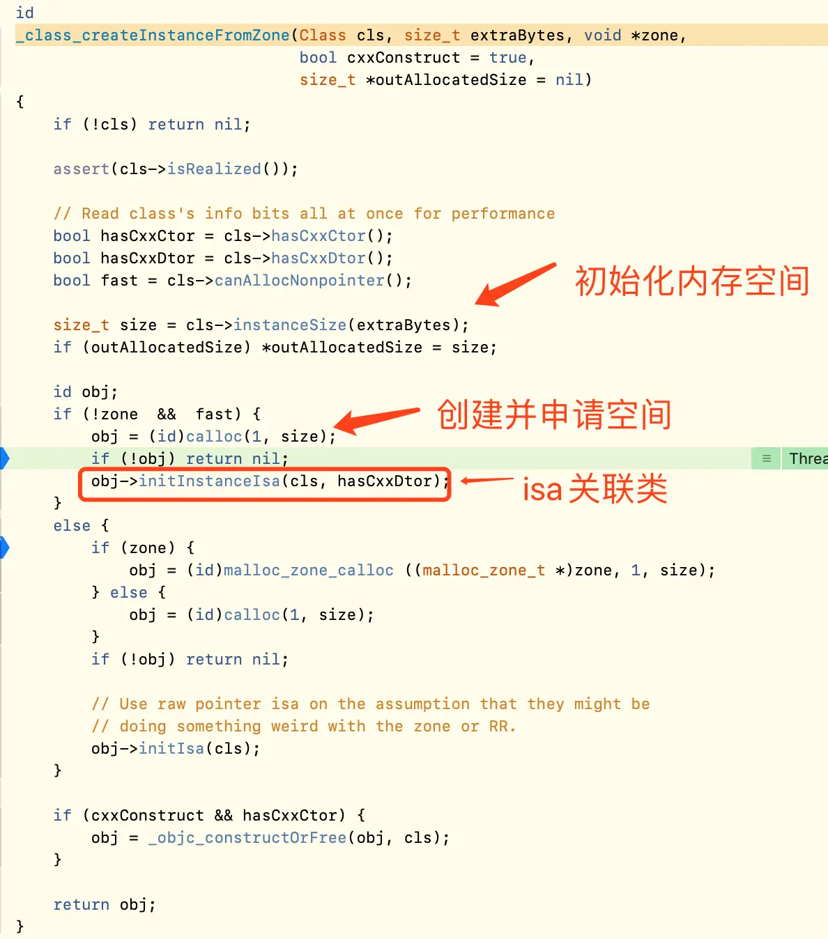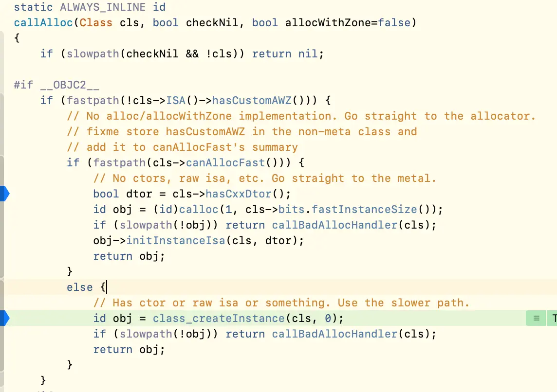 这个部份我们就根据 alloc 新建并初始化的对象流程来分析,当alloc -> _objc_rootAlloc -> callAlloc 到 callAlloc 时,这时是才是真正的开始