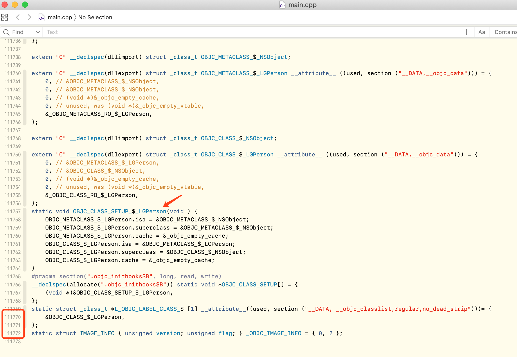 从这开始就开始分析对象的本质,要从哪下手呢,我们可以从编译的C++文件中分析,通过 clang -rewrite-objc [文件名].m -o [文件名].cpp 这条指令可以将.m 文件生成 .cpp 文件,一起来实践一下 首先准备一下要生成的文件main.m,贴出代码