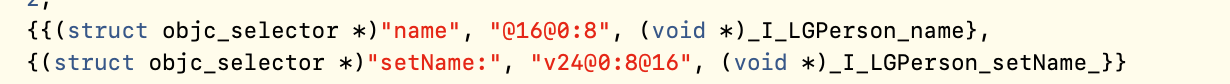 {{(struct objc_selector *)"name", "@16@0:8", (void *)_I_LGPerson_name},