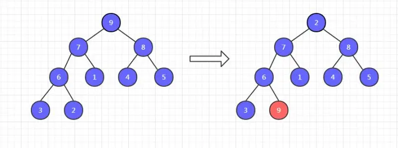 一共有九个元素,把它调整为大顶堆,然后把堆顶元素 9 和末尾元素 2 交换位置。