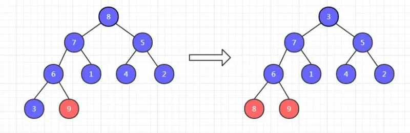 此时,9已经有序了,不需要调整。然后把剩余八个元素调整为大顶堆,再把这八个元素的堆顶元素和末尾元素交换位置,如下,8 和 3 交换位置。