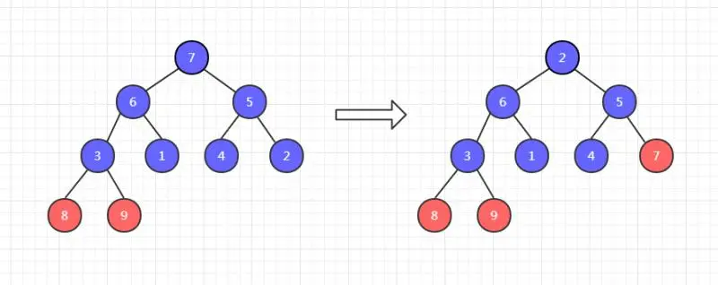 此时,8和 9 已经有序了,不需要调整。然后把剩余七个元素调整为大顶堆,再把这七个元素的堆顶元素和末尾元素交换位置。如下, 7 和 2 交换位置。