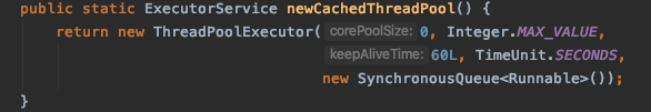 - newCachedThreadPool:创建一个按需创建的线程池,初始线程为0个,最多的线程数为Integer.MAX_VALUE。阻塞队列为同步队列,也就是队列里面只能有一个任务,加入队列就会被立刻执行。keepAliveTime=60说明当前线程在60秒内空闲则回收。