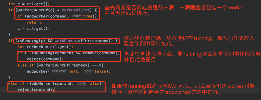 这段代码表明了大体的流程,就是如果核心线程数未到上线,首先创建核心线程执行;其次如果核心线程数已达到上限,那么将任务放到阻塞队列中;如果阻塞队列也满了,会创建新的线程去执行任务,也会检查是不是已经达到了允许的最大线程数,如果最大线程数也满了,会执行拒绝策略。
