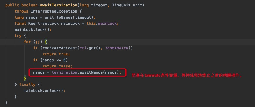 - Condition termination:mainlock的条件变量,当有线程调用awaitterminated操作时,会阻塞在这个条件变量的队列中,线程池shutdown时,会signalall唤醒阻塞的线程,阻塞的线程会恢复过来就可以进行其他的一些操作。