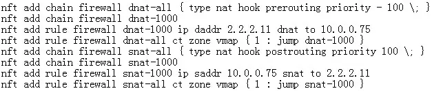 接着创建nat转发规则,dst ip address 2.2.2.11 dnat to 10.0.0.75, src ip address 10.0.0.75snat to 2.2.2.11。