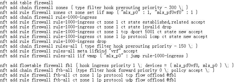 同样创建firewall规则,允许访问虚拟机的icmp和tcp 5001端口,并且把VFrepresentor port和PF port加入到flowtable做offload。
