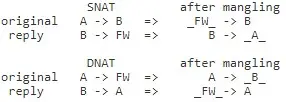 同样在SNAT下也存在类似的转换问题, 会将original方向的srcport改为reply方向的dst port, 将reply方向的src port改为original方向的source port。