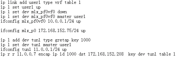 创建一台虚拟机,配置虚拟机地址为10.0.0.75,具有外部地址2.2.2.11。host创建user1的vrf,创建key 1000的gretap tunnel device tun1。将虚拟机对应的VF representor mlx_pf0vf0和tun1加入到user1 vrf。PF mlx_p0配置underlay地址172.168.152.75/24。PF对端连接物理机网卡配置地址172.168.152.208/24, 创建gretap tunnel tun, tun设备的remote为172.168.152.75,key为1000,设置地址为1.1.1.7。 首先,虚拟机与对端物理机tun设备通过tunnel相互访问: