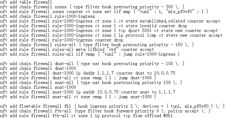 接着,创建firewall规则,允许访问虚拟机的icmp和tcp 5001端口,并且把VF representor port和tun 1隧道设备加入到flowtable做offload。 最后,创建NAT转发规则:dst ip address 2.2.2.11 dnat to 10.0.0.75、src ip address 10.0.0.75 snat to 2.2.2.11。