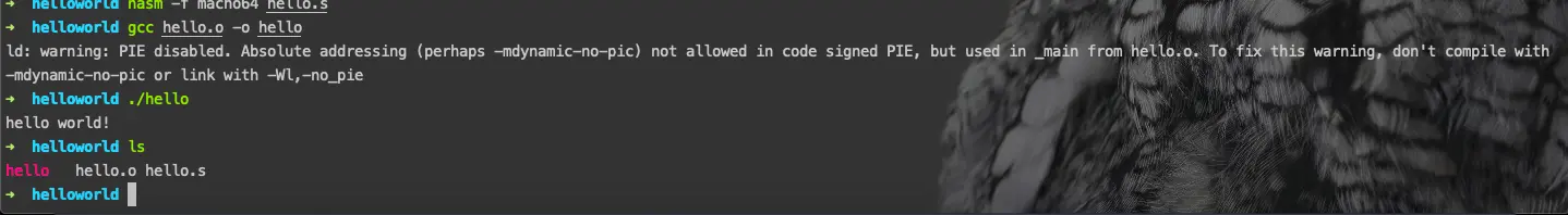 nasm -f macho64 hello.s #macho64 指定为mac64位编译后 .o文件格式gcc hello.o -o hello./hello