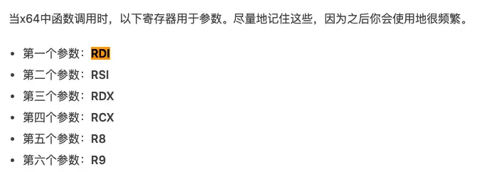 mov rdi,1 #write函数参数放入寄存器,64位汇编参数位置和顺序约定如下图