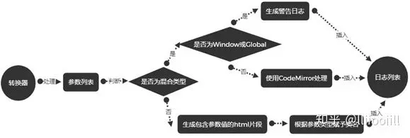 当用户编辑JavaScript输出日志的时候,会调用我重写过的Console对象的方法,这些方法参数列表和方法名(比如用户写了console.log(1,2,3),那么方法名就是'log',参数列表就是[1,2,3])传递给转换器,转换器遍历参数列表,根据参数的数据类型以及方法名赋予其不同的样式,流程如下: