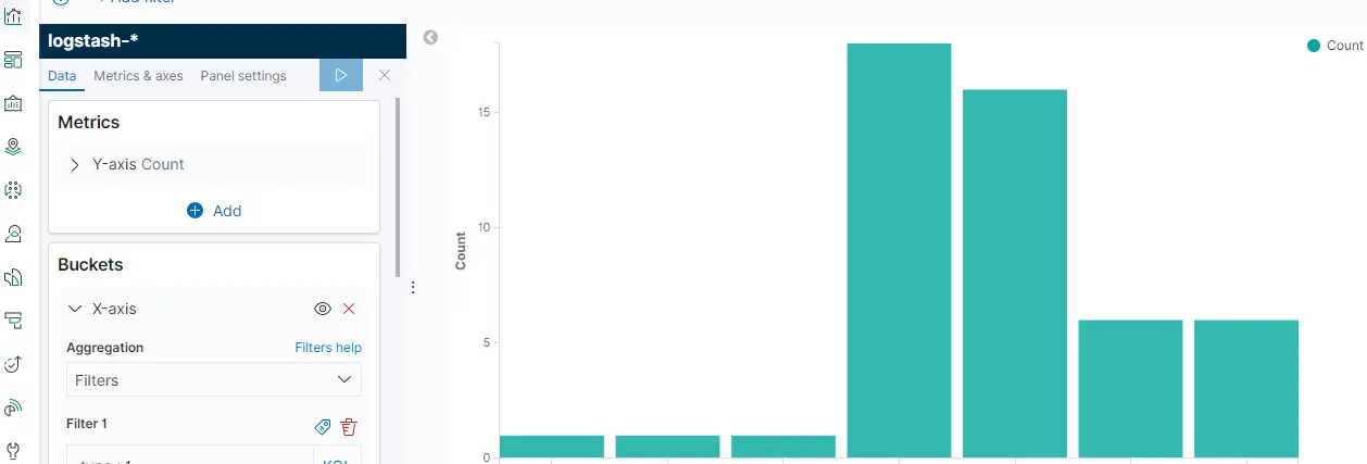 我们在kibana 进行数据展示,可以很方便的观察数据,还可以建立条形统计图,图像化方式更便于观察每种日志的对比;
