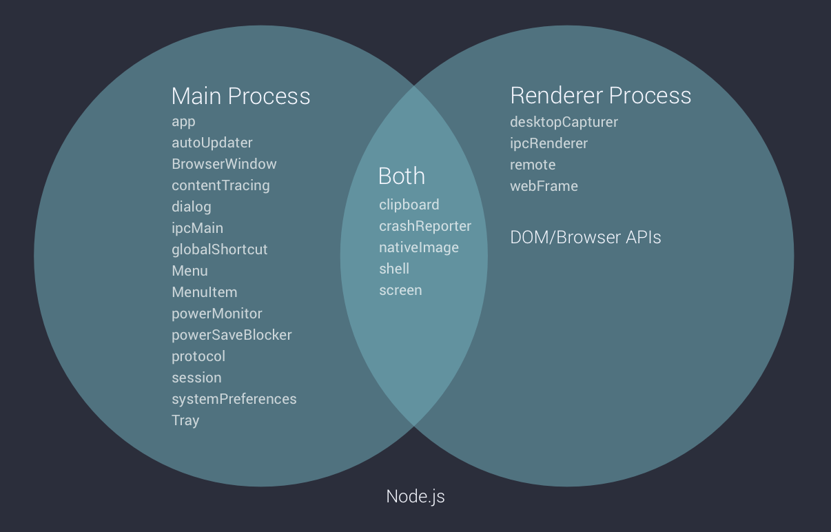 而且在 Renderer Process 可以使用 Node.js 的 API,这就赋予来 Electron 极大的能力,以下是主进程以及渲染进程可以访问到的API: