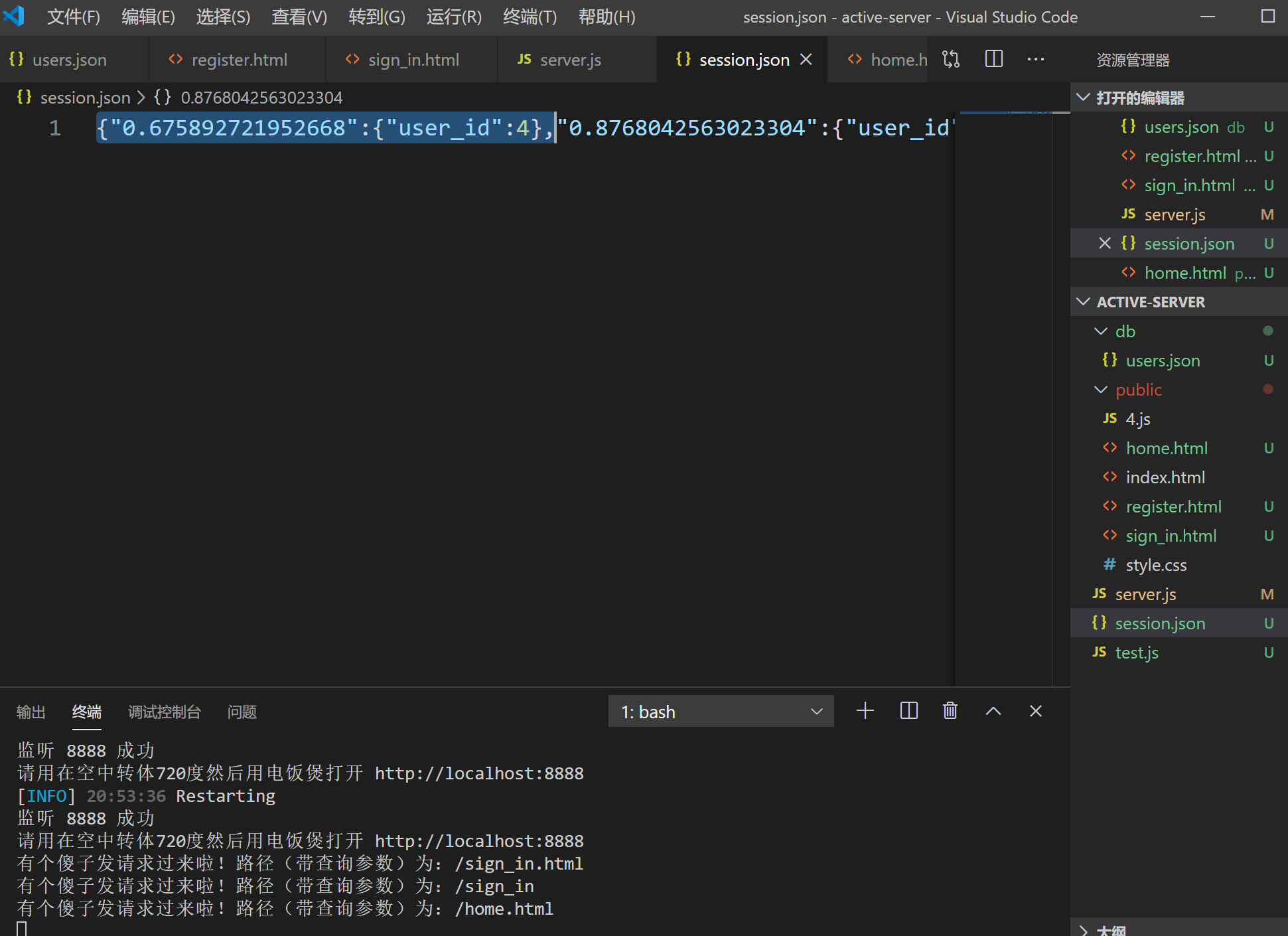 上边的代码有一个bug,我们把user.id写到cookie里,就导致用户可以篡改。怎么防止用户篡改呢?不把user.id这个信息展示出来,而是把它放到服务器里的session.json文件里,再给信息一个随机的id,我们把这个随机数放到cookie里给浏览器。这样,后端下次接收到home.html的请求时,读出来这个随机的id,然后去session.json文件里,通过session[id]读到真正的用户id。