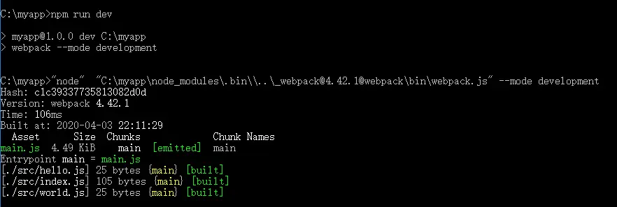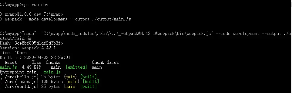 并且在 dist 目录下生成了 main.js 文件,该文件就是生成的打包文件。我们可以运行该文件,在 myapp 项目根目录下执行: