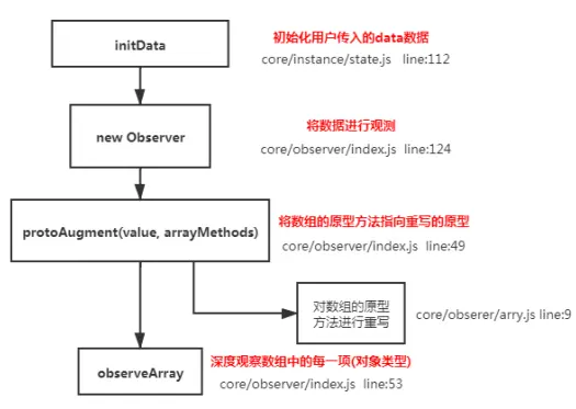 原理:initData初始化用户传入的data数据->new observer将数据进行观测->protoAugment(value,arrayMethods将数组原型方法指向重写的原型->obserArray)深度观察数组中的每一项,如果是对象类型,继续进行观测