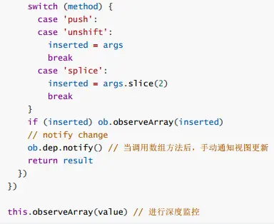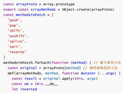 b.vue将data中的数组,进行了原型链重写,指向了自己定义的数组原型方法,这样当调用数组api是,可以通知依赖更新,如果数组中包含着引用类型,会对数组中的引用类型进行监控。