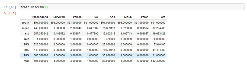 从输出结果中可以看到,我们现在操作的数据有891行,12列,总共有10692个数据。