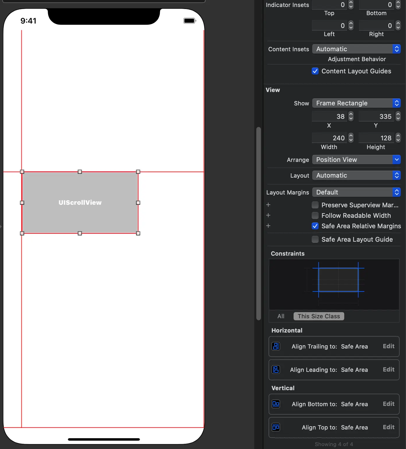 那么,下一步我们添加contentView的时候,需要注意,contentView的宽高分别设多少,有些同学可能想当然的分别设为距ScrollView上下左右为0,ScrollView只是一个容器视图,它内容的宽高应该是由contentView撑开的,所以contentView自己需要有一个宽高。那么如果是一个上下滚动的scrollView,它的宽度应该是固定的,比如是屏宽,那么contentView的宽度就是屏宽,高度是由内容撑开的,所以上下距scrollView为0即可。