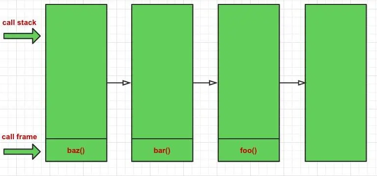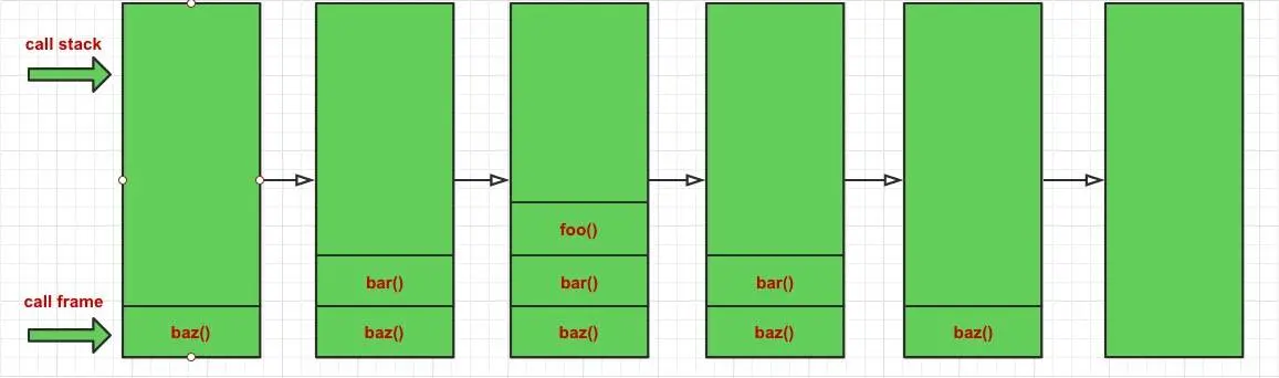foo() 执行完了,销毁调用栈中自己的记录,依次销毁 bar() 和 baz() 的调用帧,最后完成整个流程。
