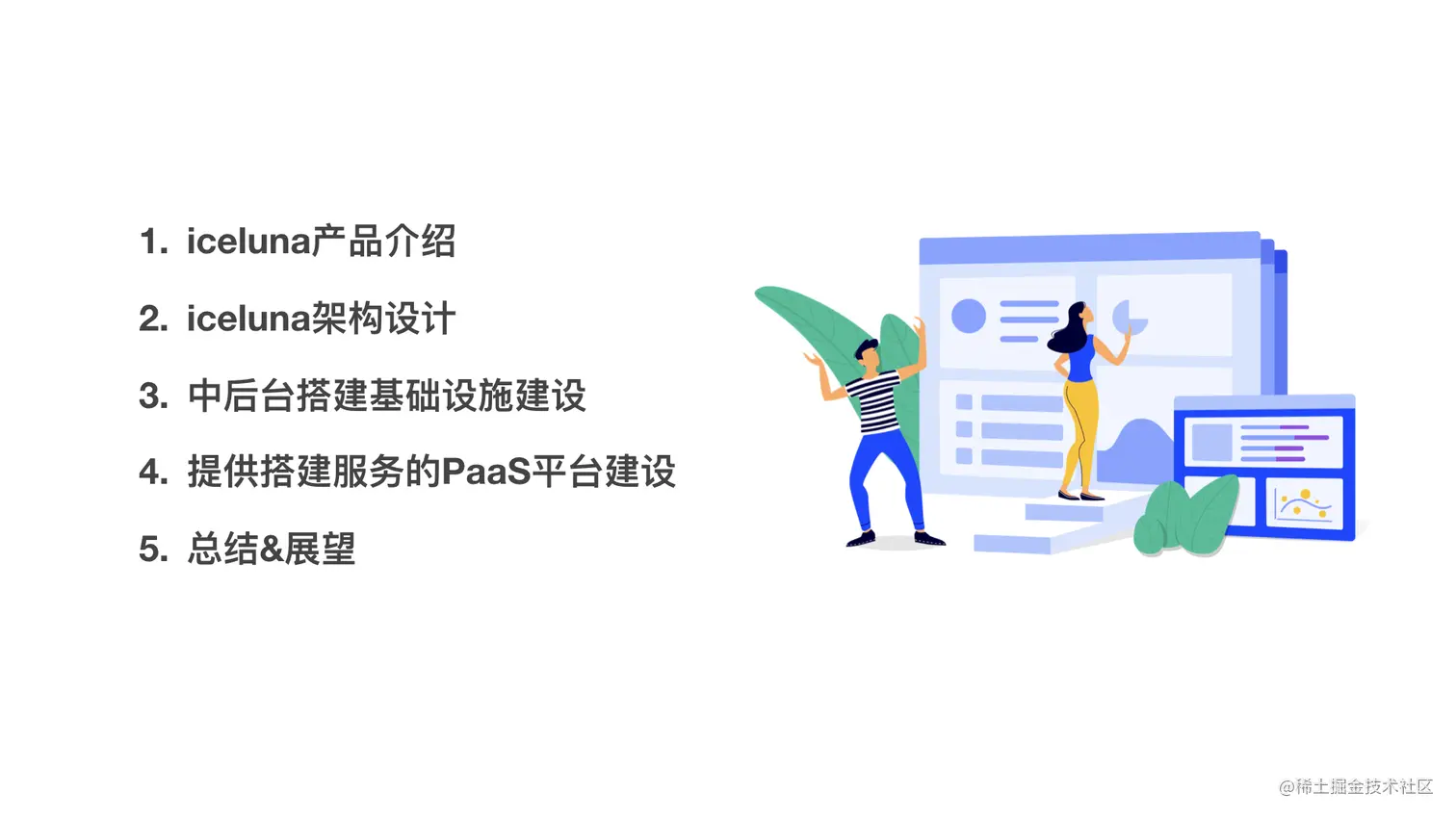 这是我分享的大纲,我会先对 iceluna 这个产品进行整体介绍,讲解下产品背景、定位及现状。第 2 部分会从架构设计、功能模块设计、研发流程设计三方面来介绍中后台搭建产品的设计思路,让大家对 iceluna 产品全貌有个基本认识。第 3 部分会着重从中后台搭建基础设施维度来讲一下 iceluna 是如何建设搭建基础设施的。第 4 部分则会回到 PaaS 平台这个焦点,来讲解 PaaS 平台需要建设的核心能力。最后会稍微做下总结和展望。