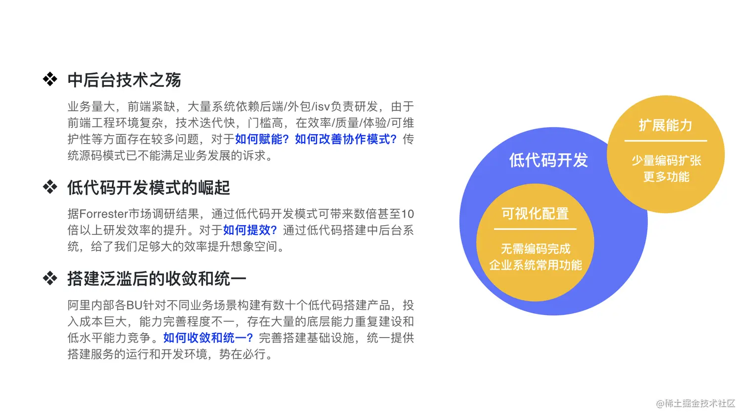 - 低代码开发模式的崛起:据 Forrester 市场调研结果,通过低代码开发模式可带来数倍甚至 10 倍以上研发效率的提升。这对于中后台现状面临的一个业务压力,是我们非常迫切需要解决的一个问题,那就是如何提效的问题。它给了我们足够大的想象空间。近年来各大互联网巨头公司都以纷纷投入到低代码或无代码平台的建设上来。在阿里的话,各大 BU 也是重兵投入到这一块的。这也就衍生出来第 3 个问题,那就是搭建泛滥后的技术收敛和统一。