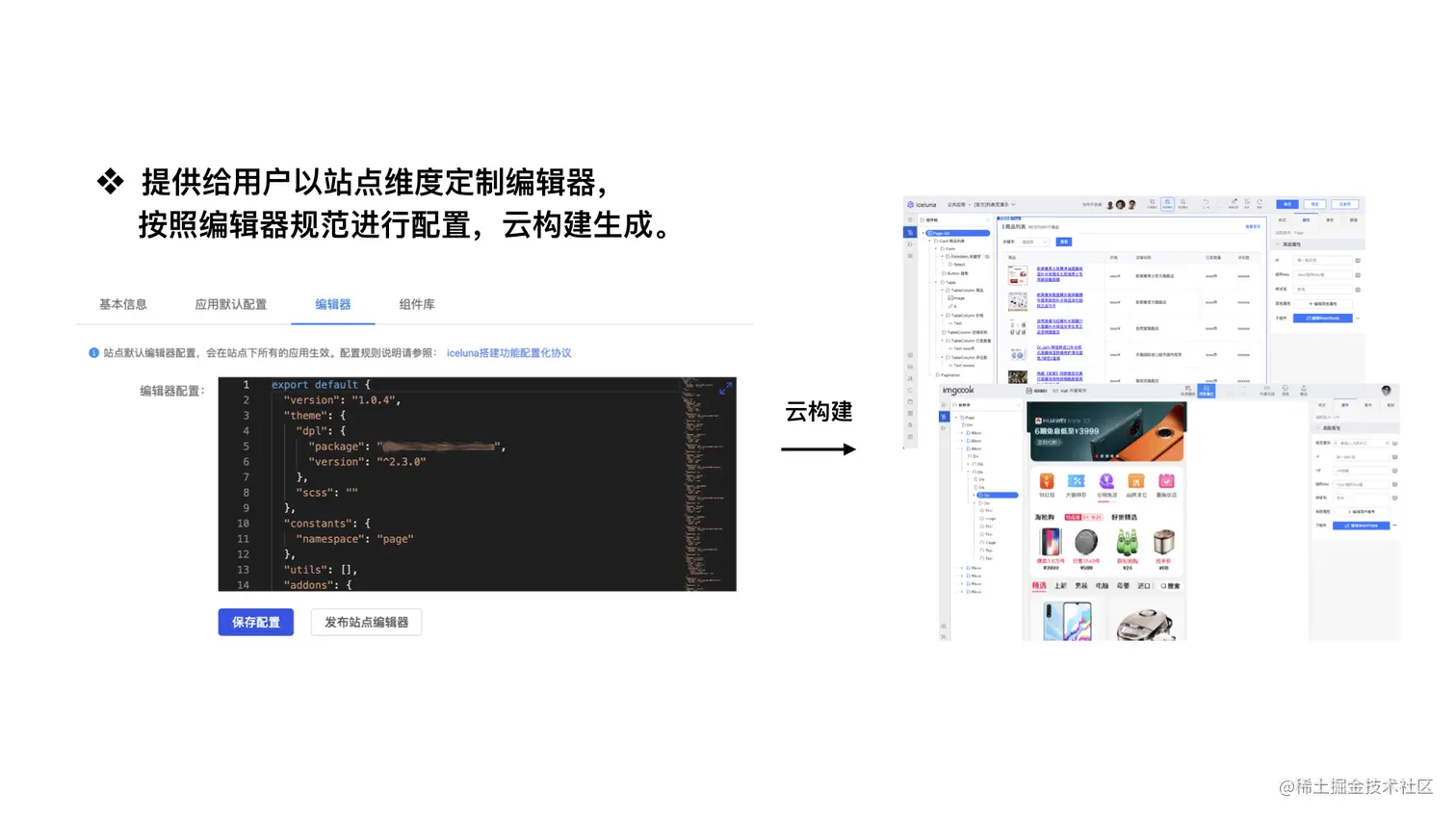 在我们的站点中心提供了一个可视的方式来进行一个编辑器的配制,通过云端构建就可以构建出不同搭建编辑器,比如右边的 Iceluna 搭建编辑器及下面的 imgcook 编辑器,就是在研发中心创建了 2 个不同的站点,分别构建出来的编辑器。刚我们看到了编辑器的一份配置,那么编辑器具体可以配置哪些内容呢?
