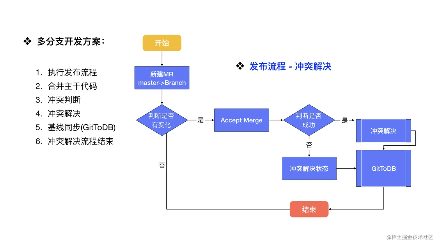 多分支并行的能力最重要解决的一个问题是冲突解决,对于源码来说,冲突解决是已经存在的一个能力,但对于低代码云端工程体系来说却是一个非常难解决的问题。截止目前为止 iceluna 冲突解决的代码仍然是搭建描述协议 Schema 的代码,比对时相对比较困难,这是问题之一。其次,总个冲突解决的流程,多分支并行,包括代码回滚到数据库 DB ,这一块总个机制的构建也是相对比较复杂的。总体的流程如上图所示。
