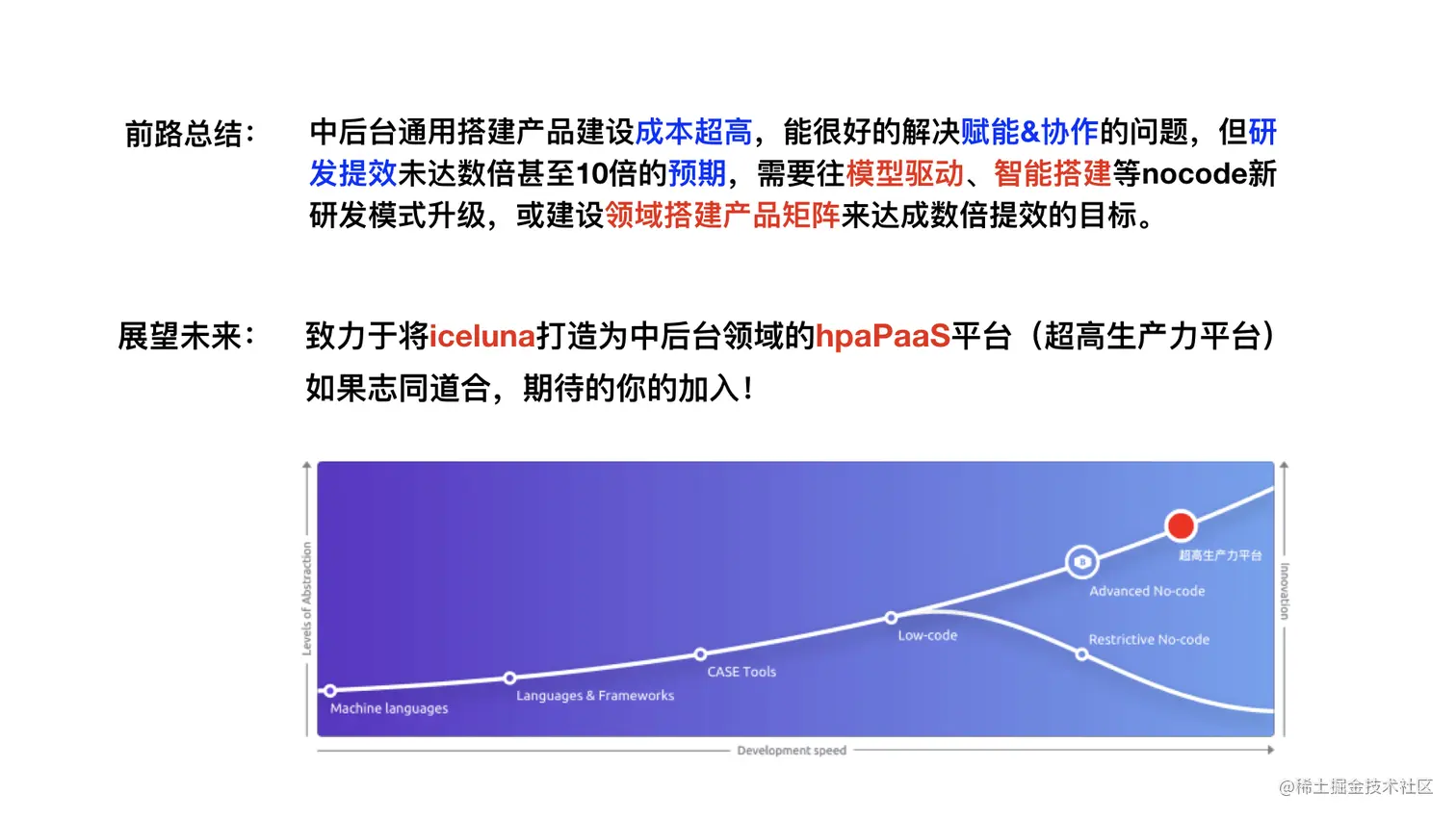 - 前路总结:中后台通用搭建产品建设成本超高,能很好的解决赋能&协作的问题,但研发提效未达数倍甚至 10 倍的预期,需要往模型驱动、智能搭建等 Nocode 新研发模式升级,或建设领域搭建产品矩阵来达成数倍提效的目标。