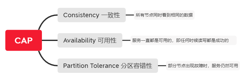 - 可用性:在正常运行的节点中都应在有限的时间内给出响应