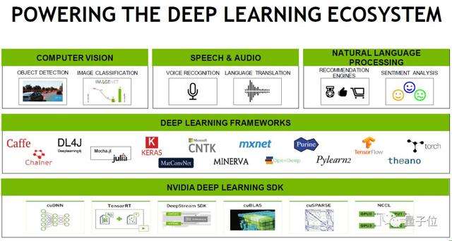 它很好的诠释了深度学习的架构,从应用角度来说,视觉、语音识别、NLP等是目前发展较快的领域。市面上有很多框架支持这些深度学习的应用,如Caffe、TensorFlow、PyTorch等,而支撑起这些框架的基础是强大的计算能力。