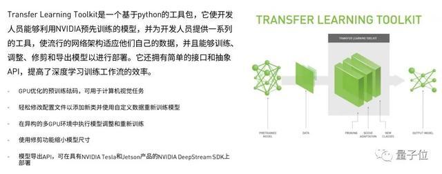NVIDIA迁移式学习工具包(Transfer Learning Toolkit,简称TLT)是一个基于Python的工具包,它提供了大量预先训练的模型,并提供一系列的工具,使流行的网络架构适应开发者自己的数据,并且能够训练、调整、修剪和导出模型,以进行部署。