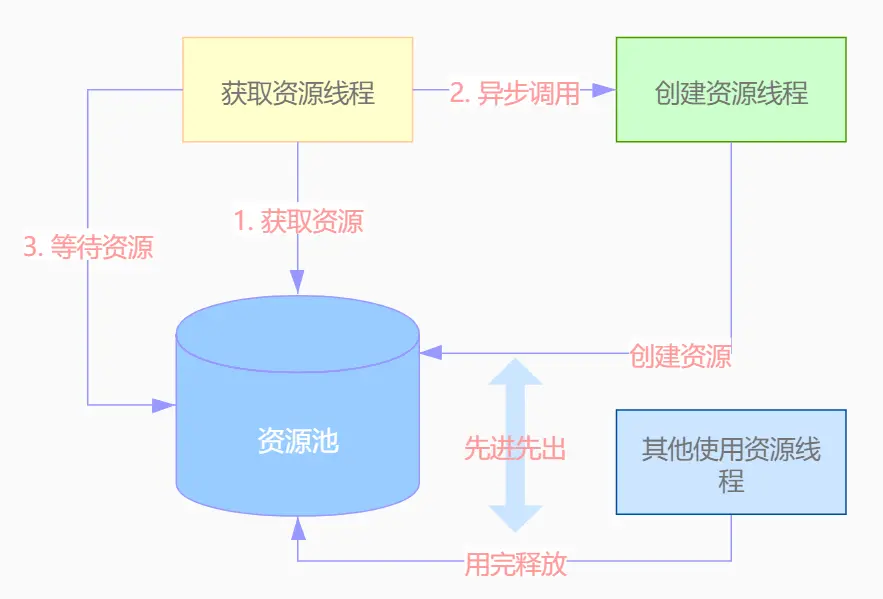 4.创建资源线程异步创建资源,创建资源时会判断是否有需要获取资源的线程在等待资源,如果有才创建,否则就不创建