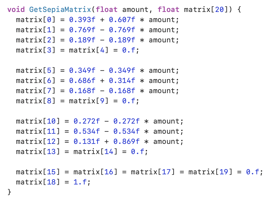 那么为什么上面需要用一个矩阵计算呢,实际上统一成一个矩阵有一个显而易见好处是做多重变换的时候,只需要对这个矩阵进行累乘得到一个最终的矩阵即可,类似于transform. 例如可以在灰阶之后再加上棕褐色(sepia)的处理: