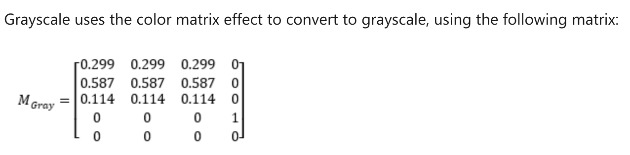 }这个便为灰阶grayscale的矩阵获取方式,如果CSS传的amount值为1(上面参数的便为1 - amount = 0,代码传参的时候使用了和1的差值),那么将得到以下矩阵: