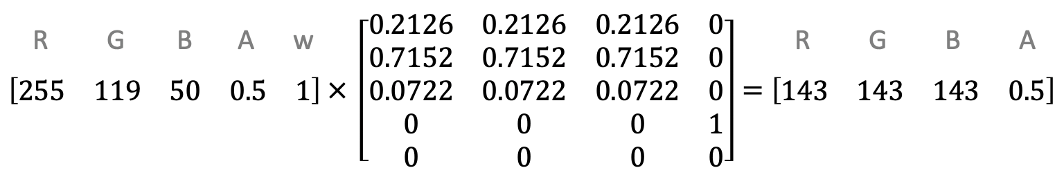 这个矩阵便是用来对每个像素点进行转换,假设某个像素点的像素值为rgba(255, 119, 50, 0.5),那么这个像素点转换计算如下: