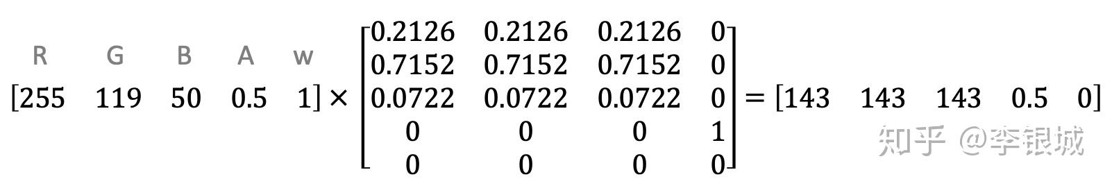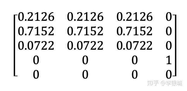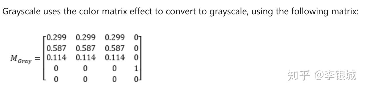 }这个便为灰阶grayscale的矩阵获取方式,如果CSS传的amount值为1(上面参数的便为1 - amount = 0,代码传参的时候使用了和1的差值),那么将得到以下矩阵:
