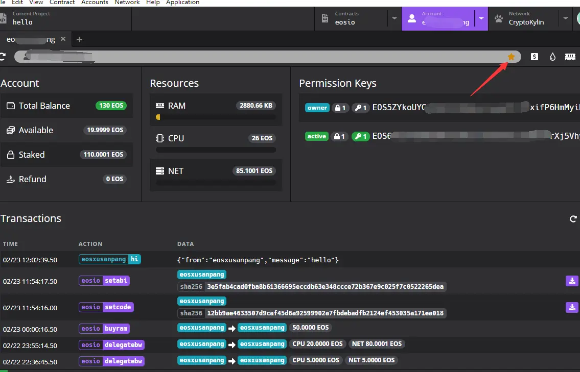到这里eos studio的配置就结束了,接下来创建一个hello的合约,然后编译,部署到Kylin网创建好的account。详情请看图: