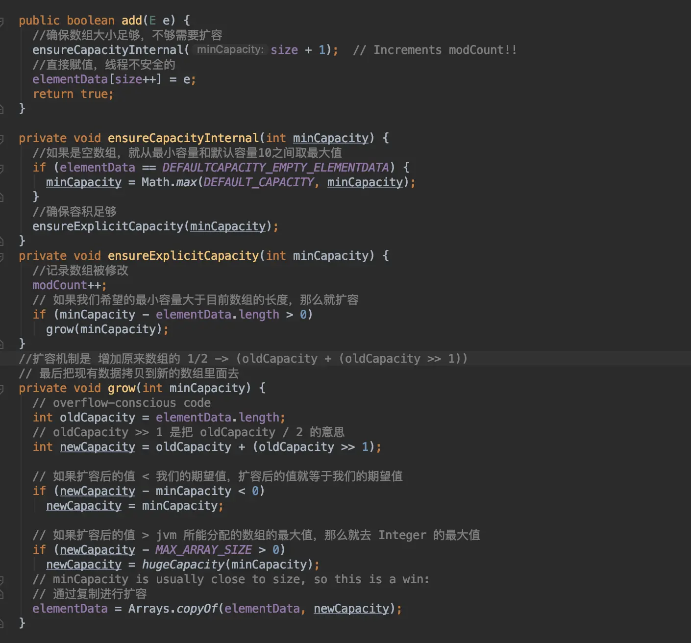 add(E)函数存入数据,先取得最小可以扩容的大小minCapacity = 103、如果我们希望的最小容量大于目前数组的长度(默认是空数组),那么就扩容