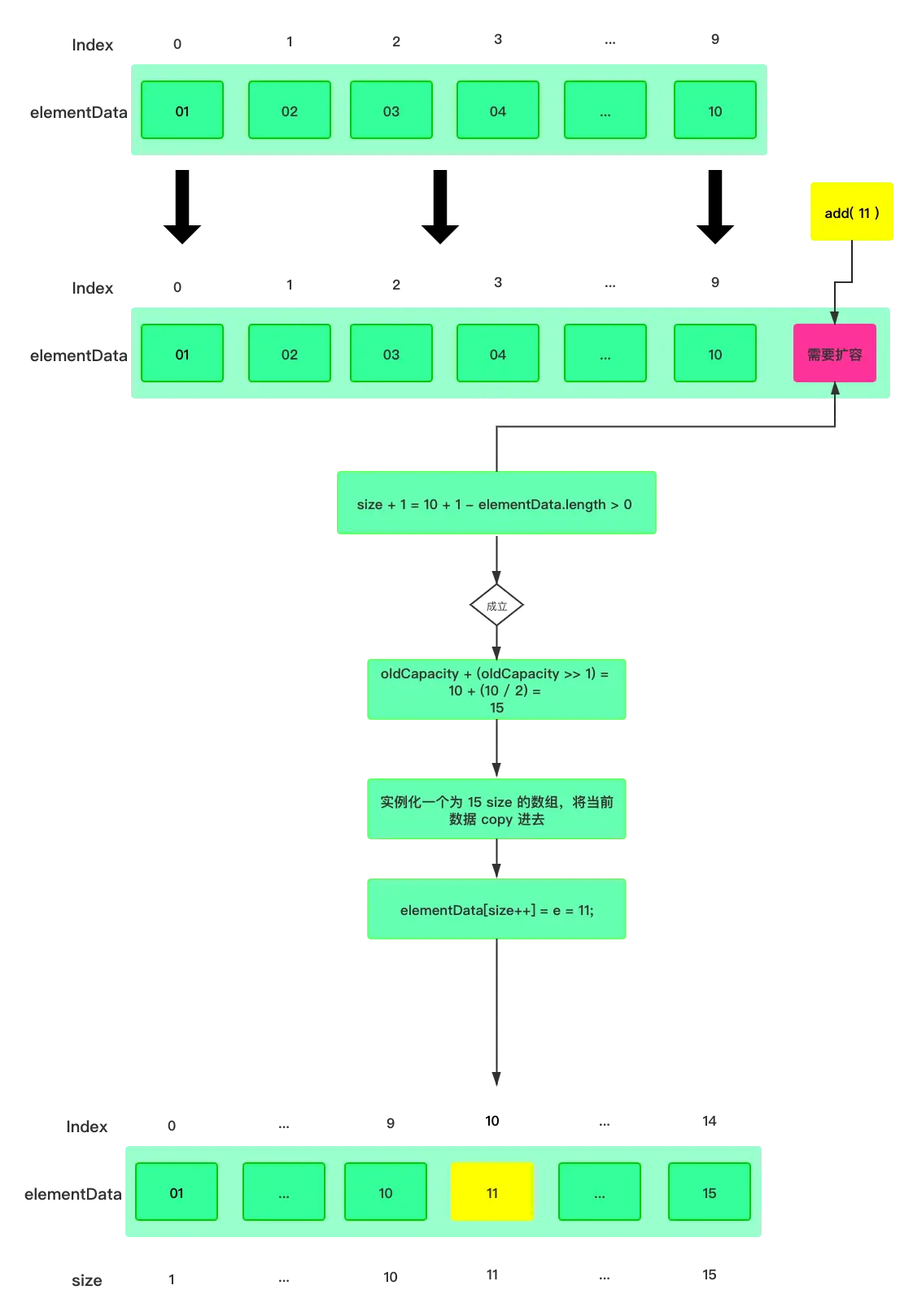 elementData[size++] = e形式添加。这就是一个详细的添加和扩容过程。这里也可以用一张图来进行说明(详细代码我就不贴了,主要讲解以什么思路来回答面试官),如下所示: